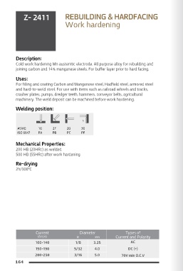 joining carbon and 14% manganese steels. For buffer layer prior to hard facing. is crack and pore free and resistant to impact stress. Can be machined only by